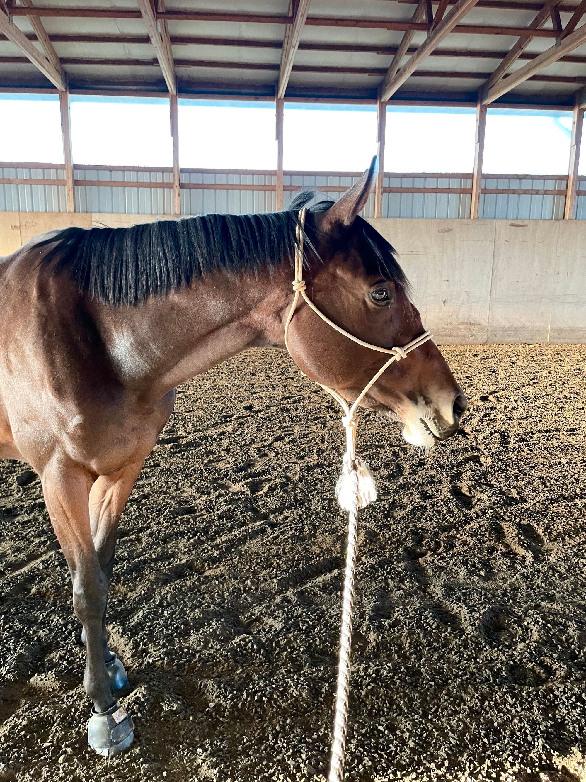As the sun went down and we walked together side by side in the indoor with both end doors open to let the air flow through, the golden hour sunlight washed over her brilliant bay coat. I stopped to take a photo of her because of how beautiful she looked. Then, I noticed her eyes start to change. They went from conveying pain and anguish to instead conveying a softness and gratitude.